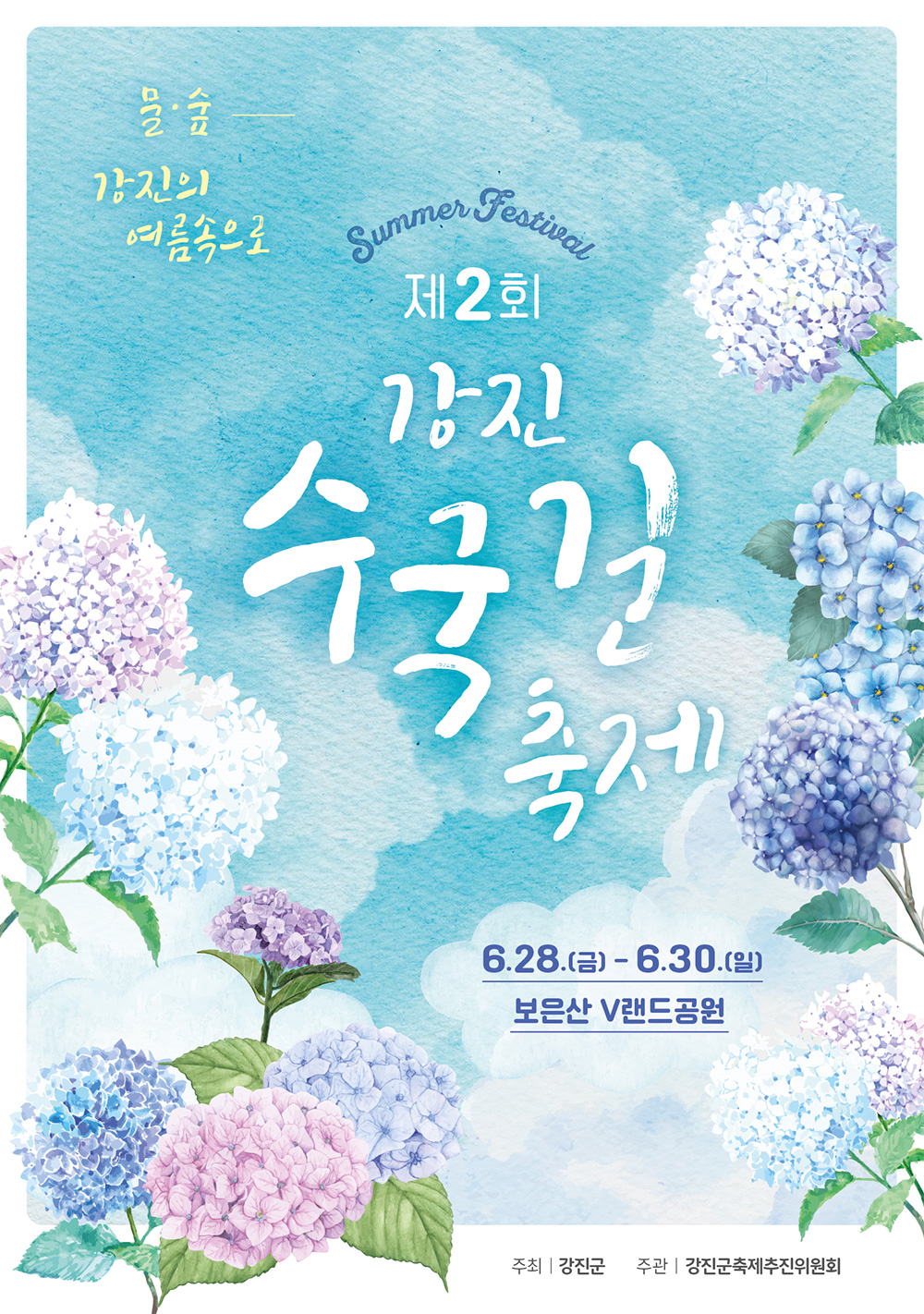 강진수국길축제는 2024년 6월 28일부터 6월 30일까지 3일간 진행됩니다. 이번 축제는 강진군의 보은산 V랜드에서 열립니다. 보은산 V랜드는 다양한 즐길 거리와 함께 아름다운 자연경관을 자랑하는 곳으로, 축제와 함께 자연을 즐길 수 있는 최적의 장소입니다.