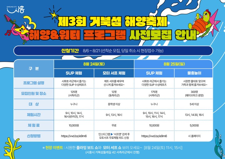 - 해양 및 워터 프로그램: 시화호투어, 해양레저체험, 거북섬 물총놀이, 써머 패션위크