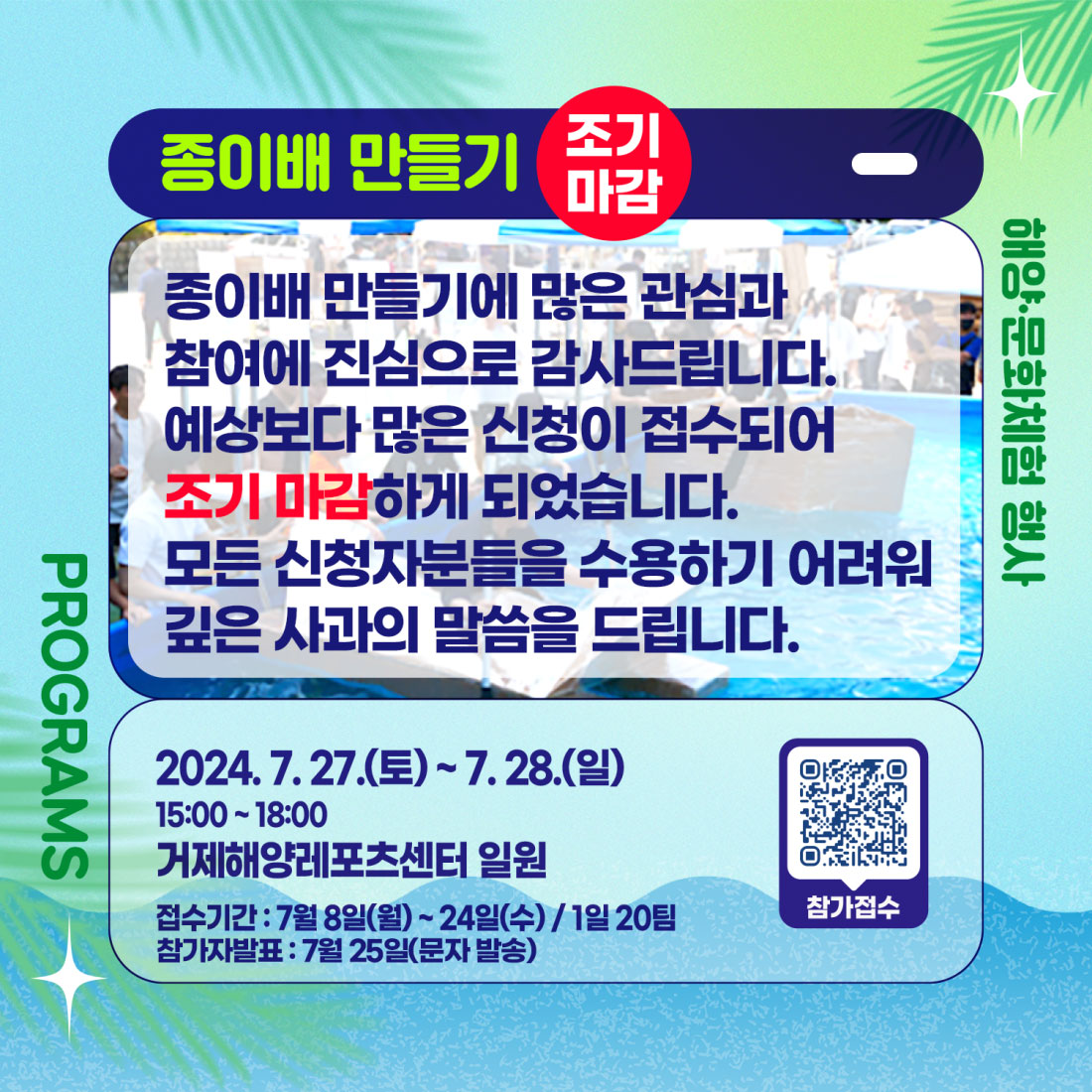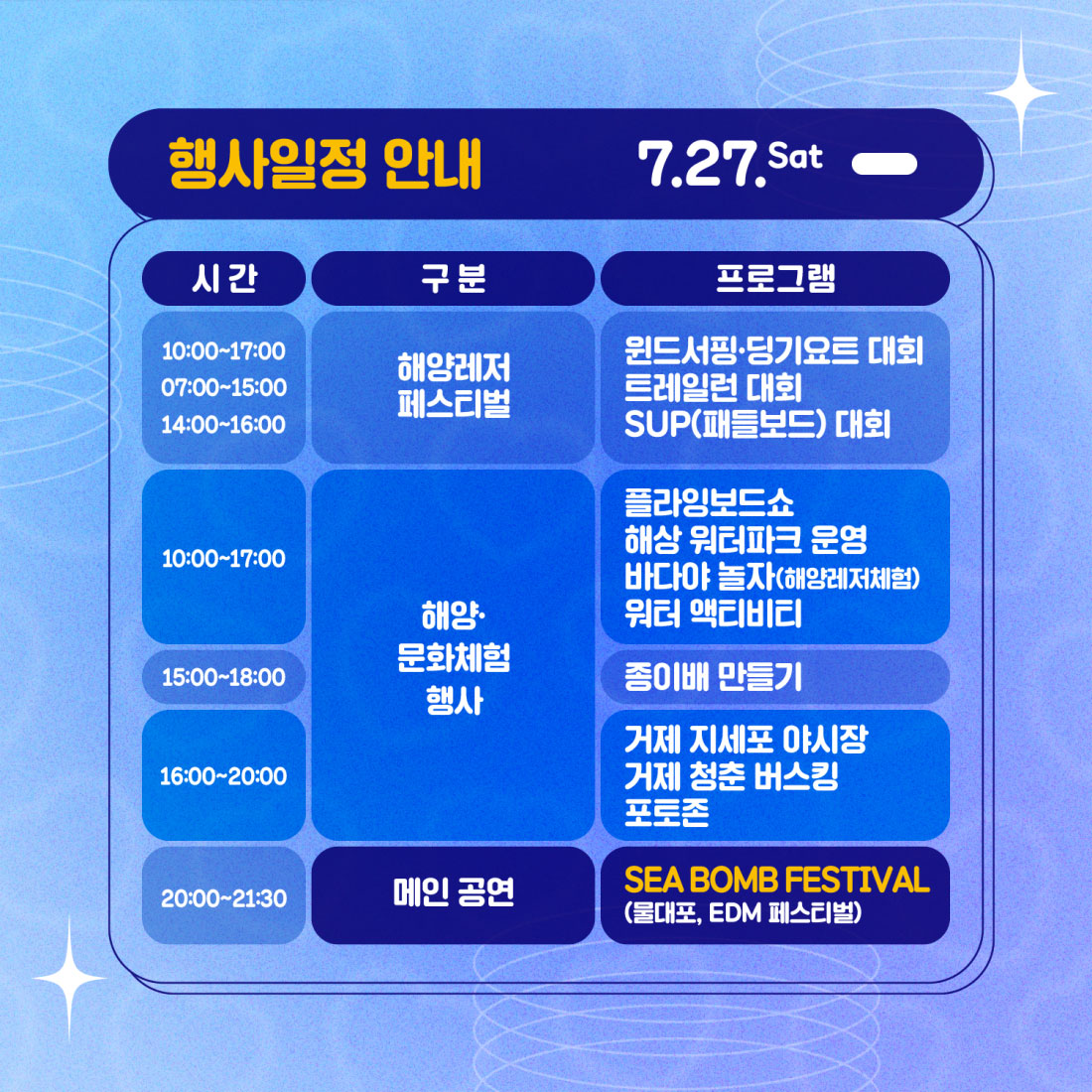 • 해상 워터파크 / 플라잉보드 공연 / 해양레저체험 / 워터 액티비티 / 맨손 물고기 잡이 / 종이배 만들기 체험 / 문화체험 및 포토존 / 거제 지세포 야시장 / 거제 청춘 버스킹