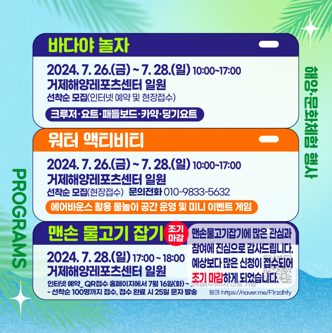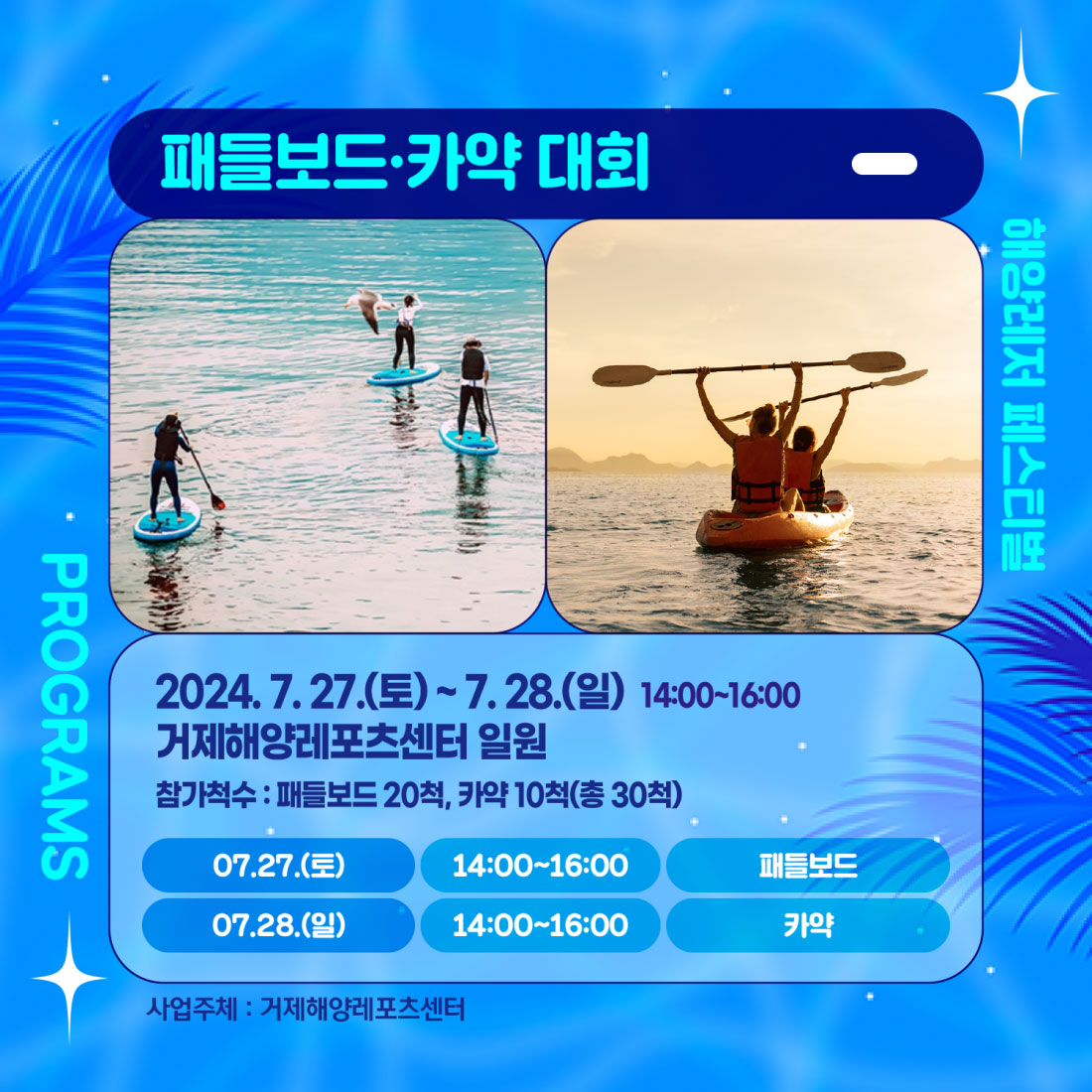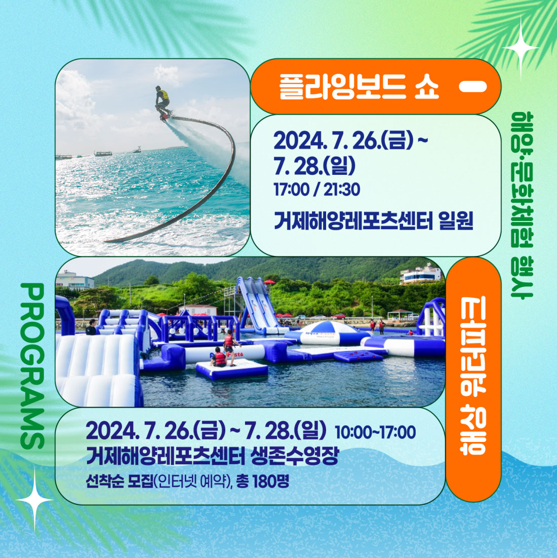 - 해상 워터파크 / 플라잉보드 공연 / 해양레저체험 / 워터 액티비티 / 맨손 물고기 잡이 / 종이배 만들기 체험 / 문화체험 및 포토존 / 거제 지세포 야시장 / 거제 청춘 버스킹