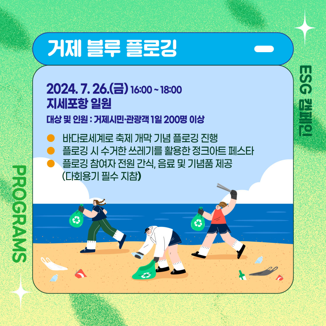 • ESG 캠페인: 거제 블루 플로깅 환경 보호를 위한 ESG 캠페인도 축제의 중요한 부분입니다. '거제 블루 플로깅’은 해변을 걸으며 쓰레기를 줍는 활동으로, 참가자들은 깨끗한 바다를 만드는 데 기여할 수 있습니다.