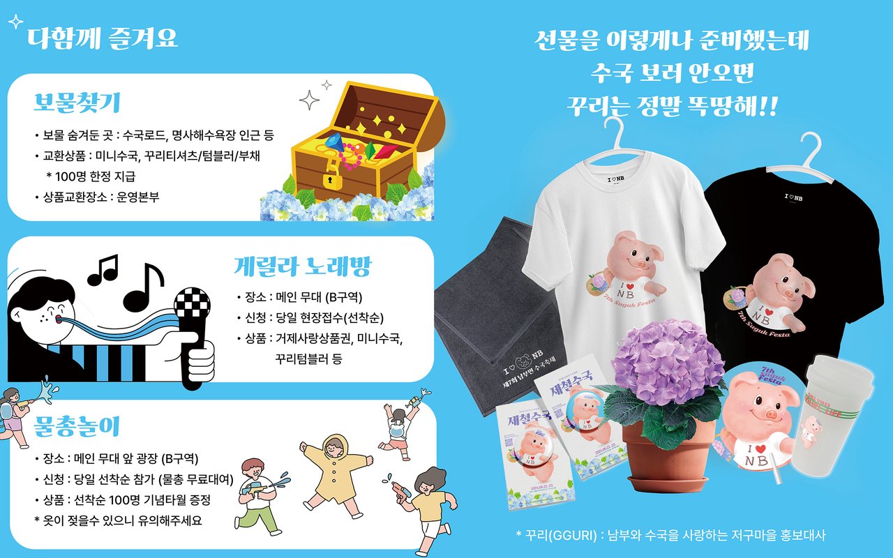 두 번째 프로그램은 보물찾기(놀보일주: 놀러 온 김에 보물일주!)입니다. 보물은 수국로드와 명사해수욕장 인근 등에 숨겨져 있으며, 상품으로는 미니수국, 꾸리티셔츠, 텀블러, 부채 등이 있습니다. 상품은 200명 한정으로 지급되며, 교환 장소는 운영본부(A구역, A-1)입니다.