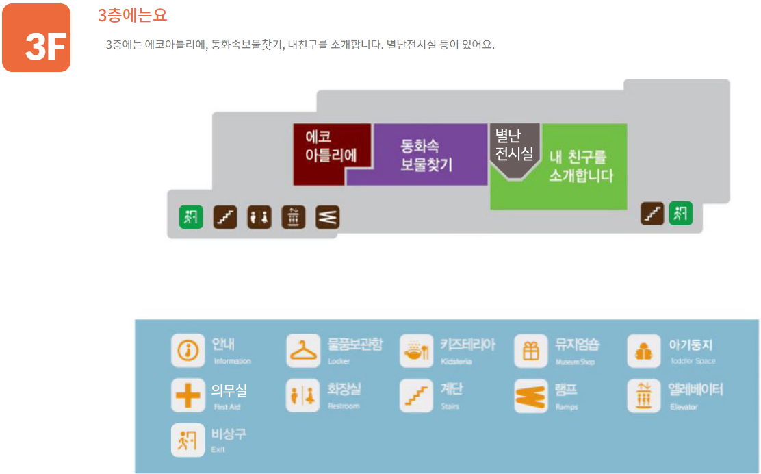 3층에는 에코아틀리에, 동화 속 보물찾기, 내 친구를 소개합니다 별난 전시실이 있습니다. 동화 속 주인공이 되어 체험해 보고, 다양한 동화를 접할 수 있는 곳입니다.
