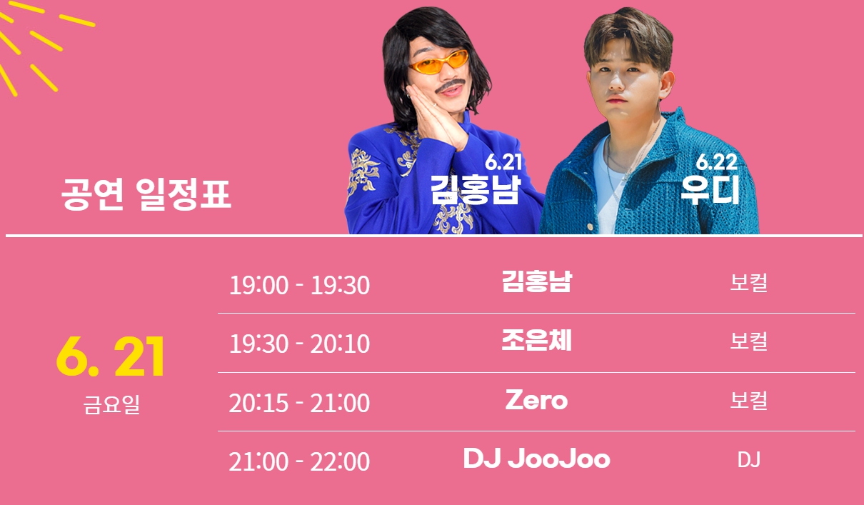- 다채로운 공연: 가수 우디, 개그맨 김홍남(김경욱)과 함께 락밴드, 디제잉(EDM), 팝, 버스킹 등 다양한 공연이 3일간 펼쳐집니다.
