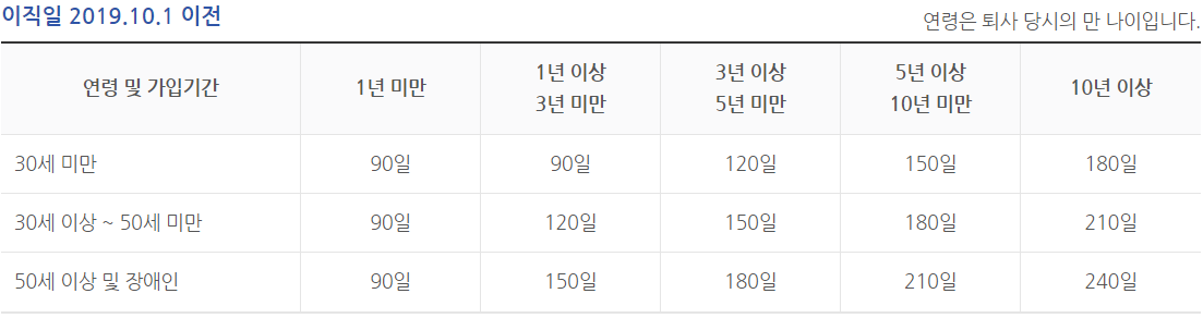 아래는 이직일이 2019년 10월 1일 이전 소정급여일수 표이므로 이에 해당되신다면 퇴직 전 평균임금의 50% x 소정급여일수를 계산하면 구직급여 지급액이 됩니다.