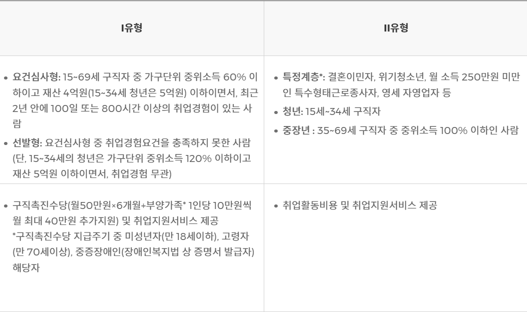 가구중위소득 60% 이하이고 재산 4억 원(15세~34세 청년은 5억 원) 이하이면서, 최근 2년 안에 100일 또는 800시간 이상의 취업경험이 있는 사람이어야 합니다. - II유형은 보다 넓은 범위의 구직자에게 지원(취업활동비용, 취업지원서비스)을 확대합니다.