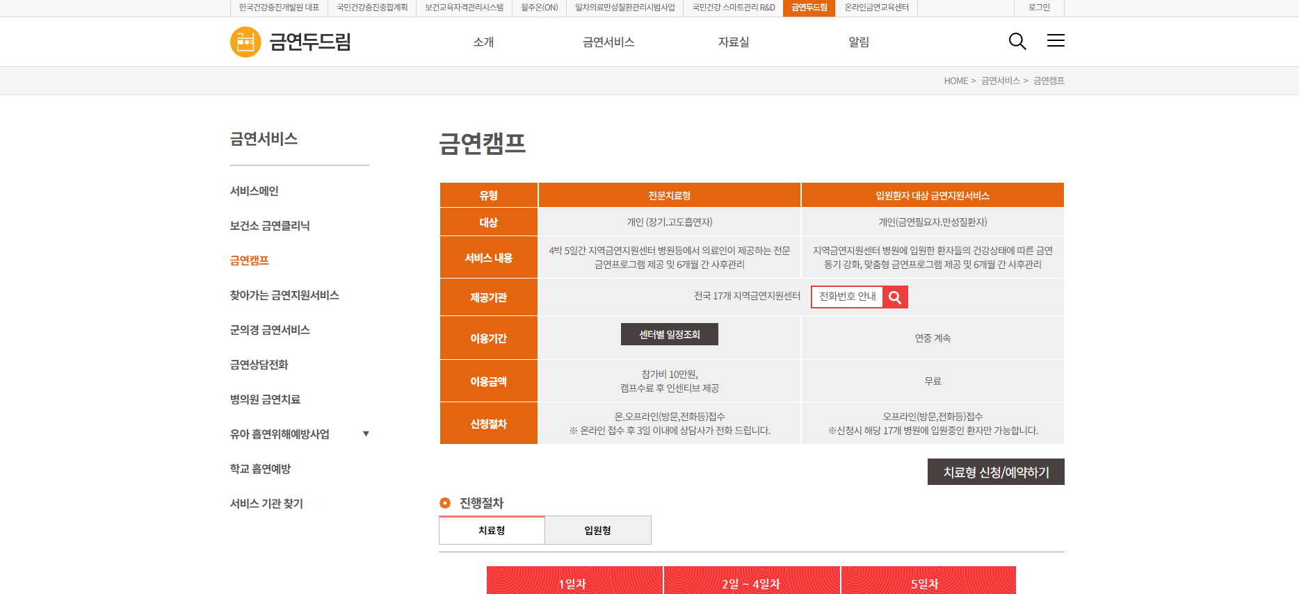 2. 금연캠프: 의료인이 제공하는 4박 5일 전문치료형 금연캠프(참가비 10만 원, 캠프수료 후 인센티브 제공), 입원환자 대상 금연지원서비스(무료) 등이 있습니다.