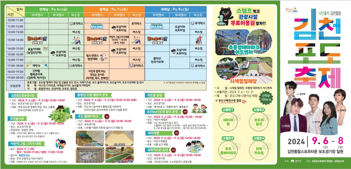 김천포도축제는 오전 10시부터 저녁 8시까지 다양한 프로그램이 연이어 진행되며, 모든 행사는 무료로 즐길 수 있습니다.