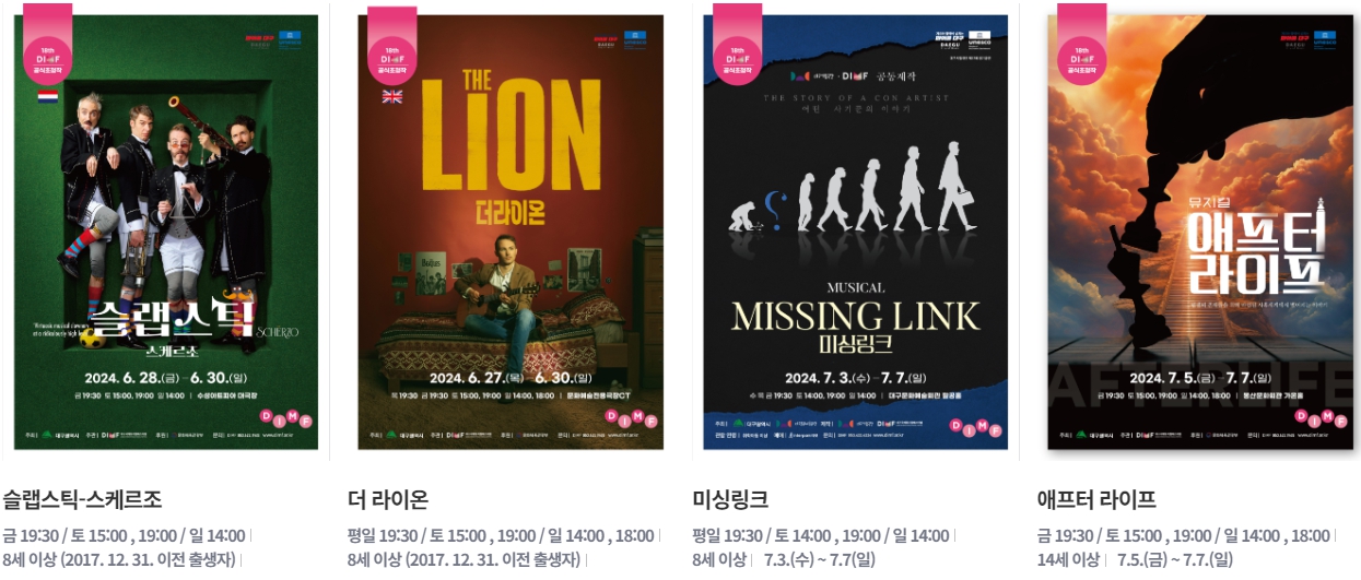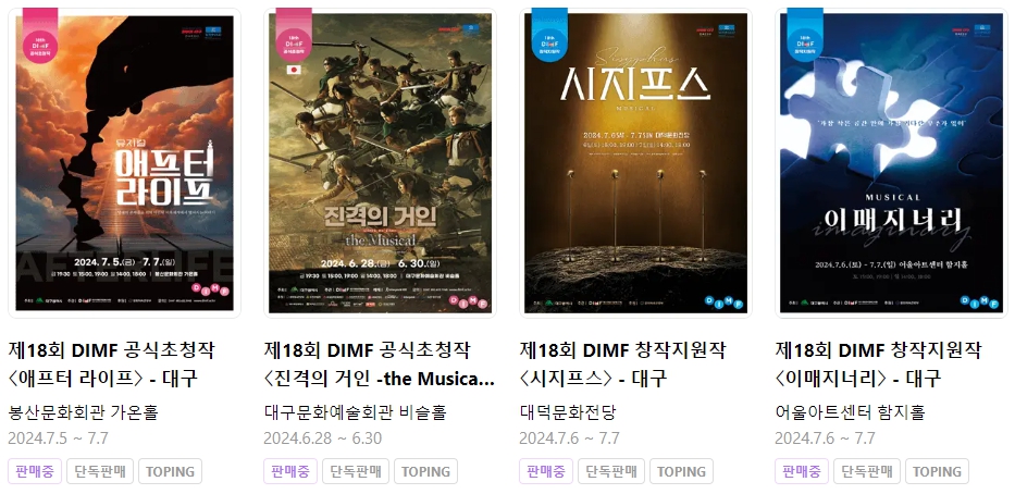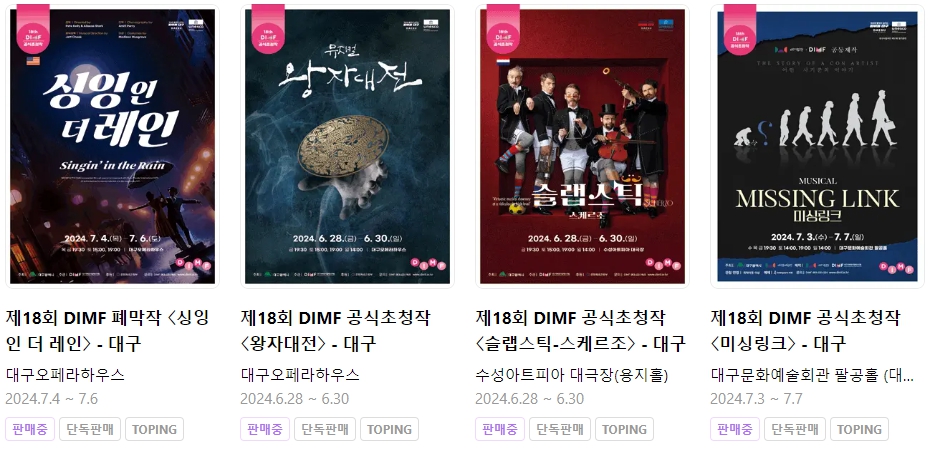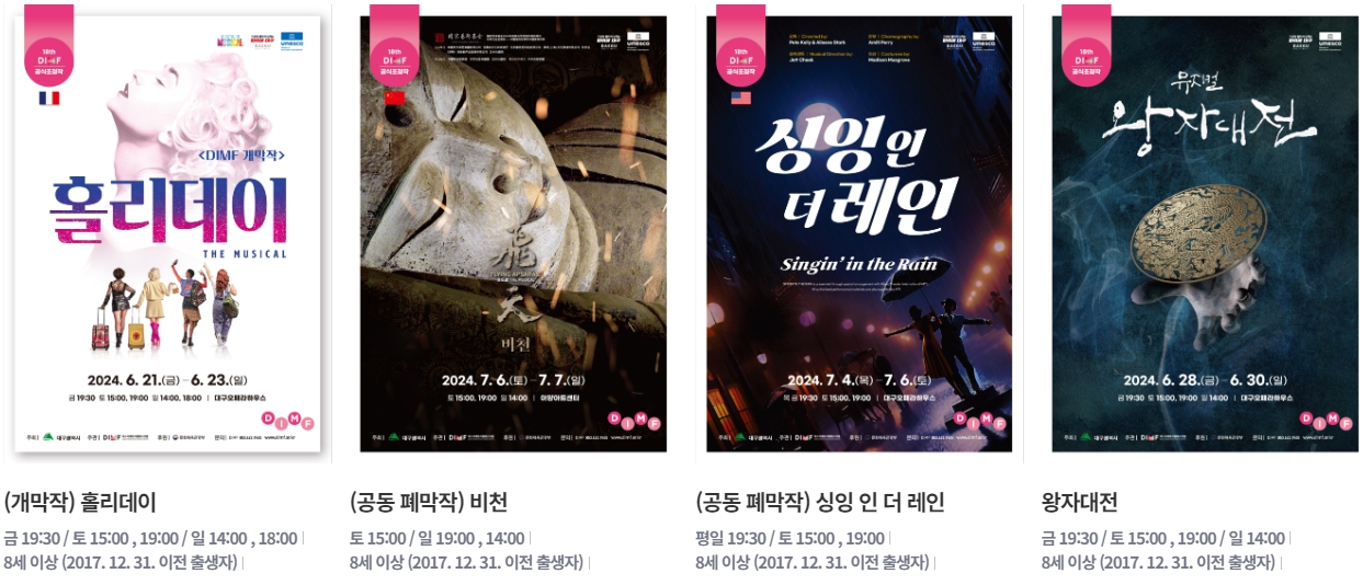 대구국제뮤지컬페스티벌의 공식초청작, 창작지원작, 폐막작이 인터파크 티켓에서 단독판매하고 있습니다.