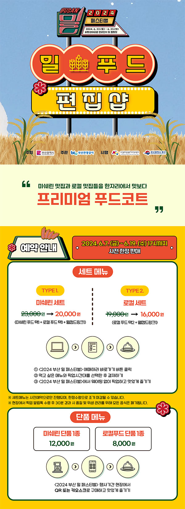 - 로컬 인기 맛집에서 미쉐린 가이드 맛집까지 즐길 수 있는 프리미엄 푸드코트입니다. 부산밀페스티벌에서만 맛볼 수 있는 특별한 메뉴들을 경험할 수 있습니다.