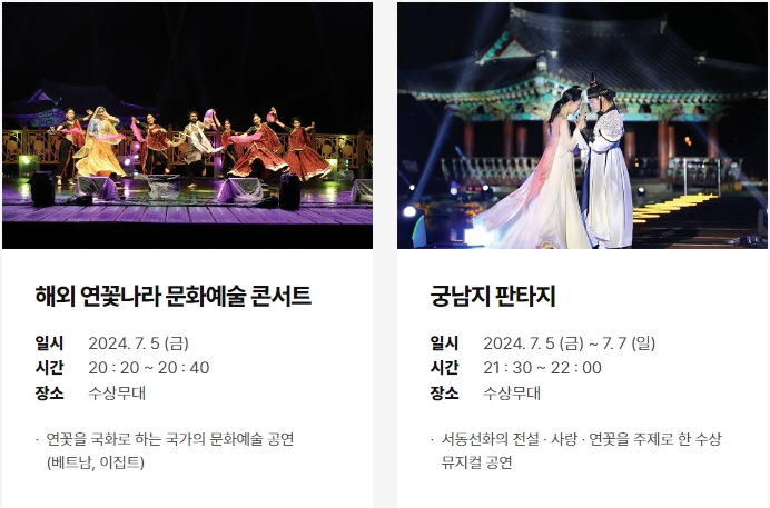 - 해외 연꽃나라 문화예술 콘서트: 연꽃을 국화로 하는 해외 예술단 초청 공연