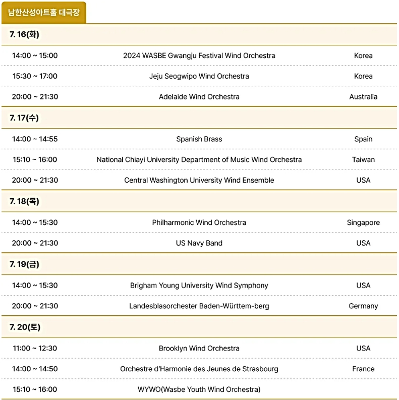 세계관악컨퍼런스의 메인 프로그램은 개막식과 폐막식, 그리고 다양한 콘서트로 구성되어 있습니다. 개막식에서는 화려한 공연과 함께 행사 시작을 알리며, 폐막식에서는 이번 컨퍼런스를 통해 얻은 다양한 성과들을 공유하는 시간이 마련됩니다. 또한, 매일 저녁 열리는 콘서트에서는 세계적인 관악 연주자들이 한자리에 모여 수준 높은 연주를 선보일 예정입니다.