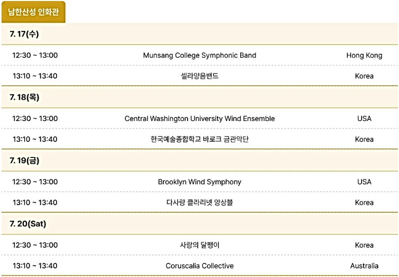 경기도 광주시 남한산성아트홀에서 열리는 세계관악컨퍼런스는 전 세계의 관악기 애호가들을 한자리에 모아 관악기의 매력을 만끽할 수 있는 특별한 행사입니다. 개폐막식과 콘서트, 프린지 페스티벌, 갈라 디너 등 다양한 프로그램이 준비되어 있으니, 관악기의 아름다움을 느끼고 싶은 분들은 꼭 참여해 보시기 바랍니다.