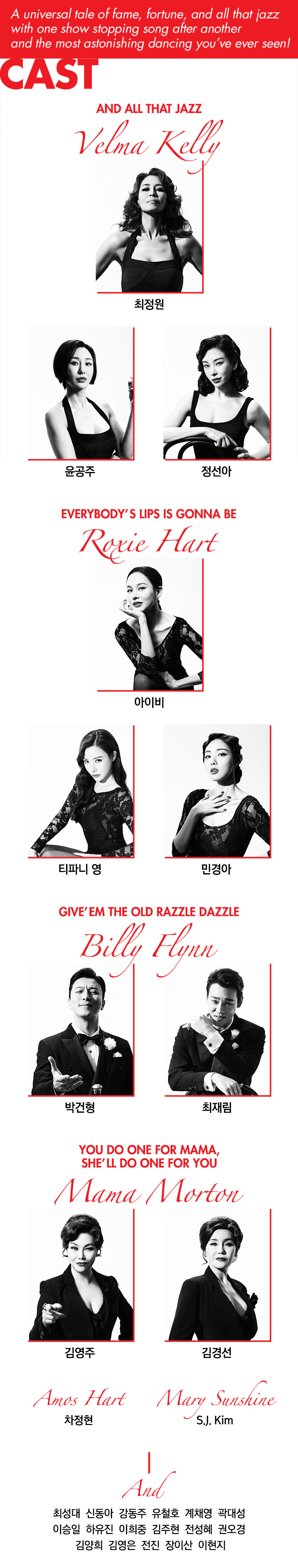 이번 시카고 뮤지컬 캐스팅은 국내 최고의 배우들이 참여합니다. 록시 하트 역에는 유명 뮤지컬 배우 아이비, 티파니 영, 민경아, 벨마 켈리 역에는 실력파 배우 최정원, 윤공주, 정선아가 출연합니다. 빌리 플린 역은 다재다능한 배우 박건형, 최재림이 맡아, 공연의 완성도를 높입니다.