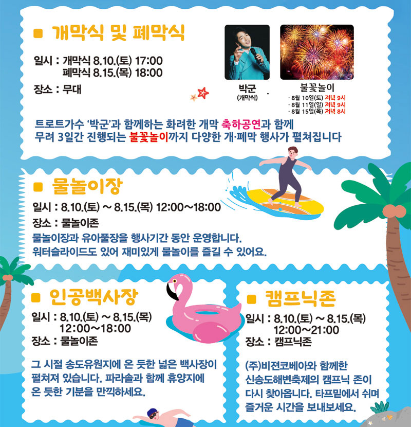 신송도해변축제는 가족 단위 방문객뿐만 아니라 친구, 연인들에게도 잊지 못할 시간을 선사합니다. 축제 기간 동안 송도달빛공원은 사람들로 북적이며, 즐거움과 환호가 가득할 것입니다. 이번 여름, 신송도해변축제에서 시원한 바람과 함께 여름을 제대로 만끽해 보세요!