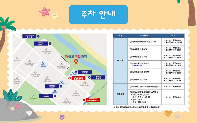신송도해변축제 기간 동안 송도달빛공원 인근에 마련된 주차장을 이용할 수 있습니다.