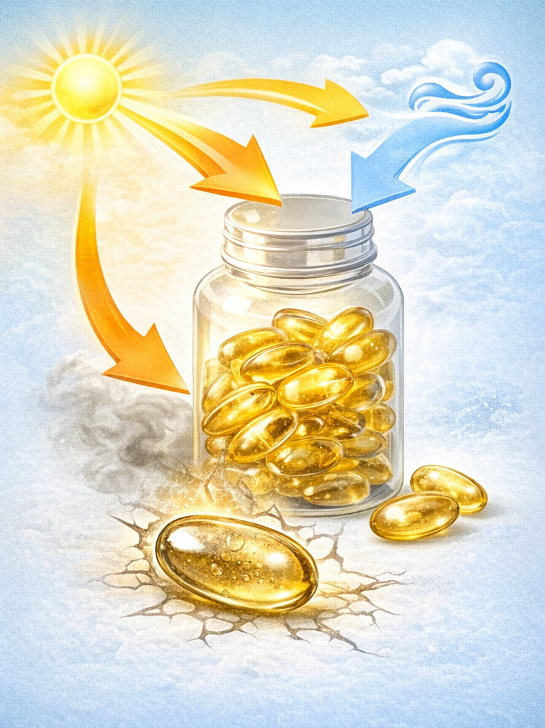오메가3는 지방산 특성상 공기/빛/열에 노출되면 산화(산패)가 진행될 수 있어요.