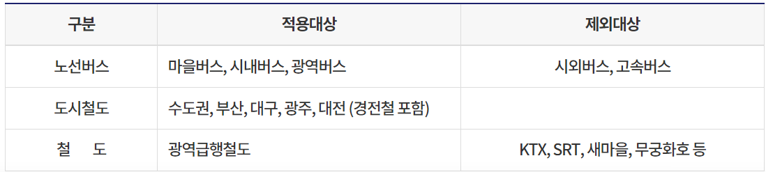 - 이용범위 : 전국 버스, 철도 ※ KTX, 새마을, 무궁화호 등 일반 철도 제외