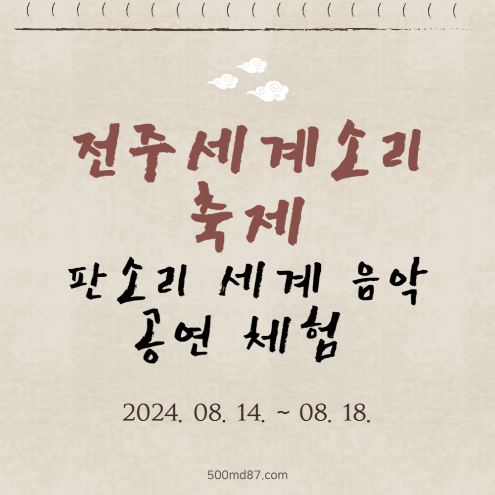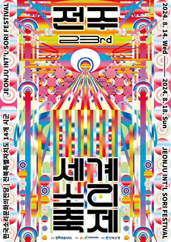 전주세계소리축제 2024는 8월 14일부터 18일까지 진행되며, 전주의 주요 공연장과 한옥마을 등 다양한 장소에서 열립니다. 축제는 판소리, 전통음악, 세계 음악 공연, 그리고 전통문화 체험 프로그램으로 구성되어 있어 다채로운 문화 경험을 제공합니다.