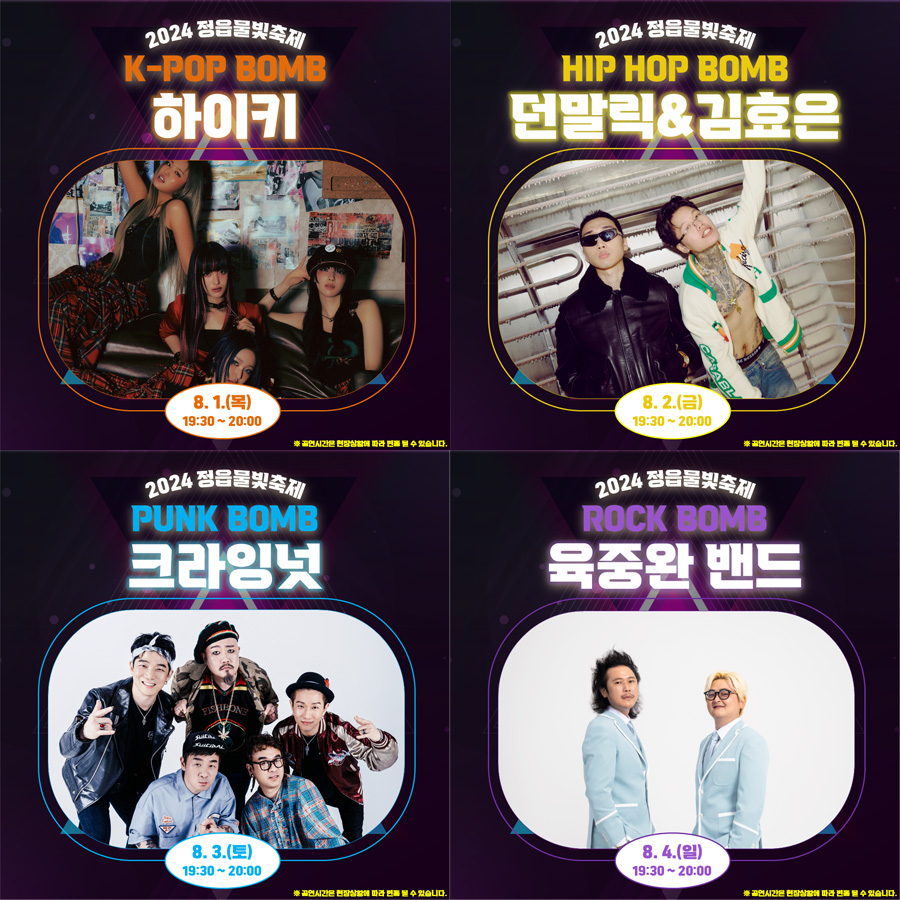 정읍물빛축제는 8월 1일부터 4일까지 나흘간 진행되며, 매일 다양한 프로그램이 준비되어 있습니다. 첫날에는 걸그룹 하이키의 공연이, 둘째 날에는 힙합 가수 던말릭과 김효은의 무대가 펼쳐집니다. 셋째 날에는 인디밴드 크라잉넛이, 마지막 날에는 육중완밴드가 축제의 대미를 장식합니다. 또한, 워터슬라이드와 워터롤 등 다양한 물놀이 기구도 설치되어 있어 가족 단위 방문객들에게 큰 인기를 끌고 있습니다.