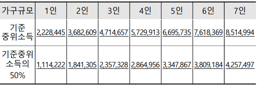 위의 표와 같이 2024년 중위소득의 50%인 금액을 확인하시기 바랍니다.