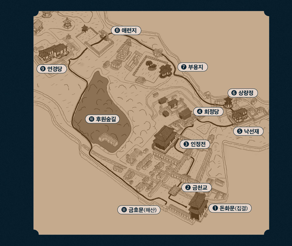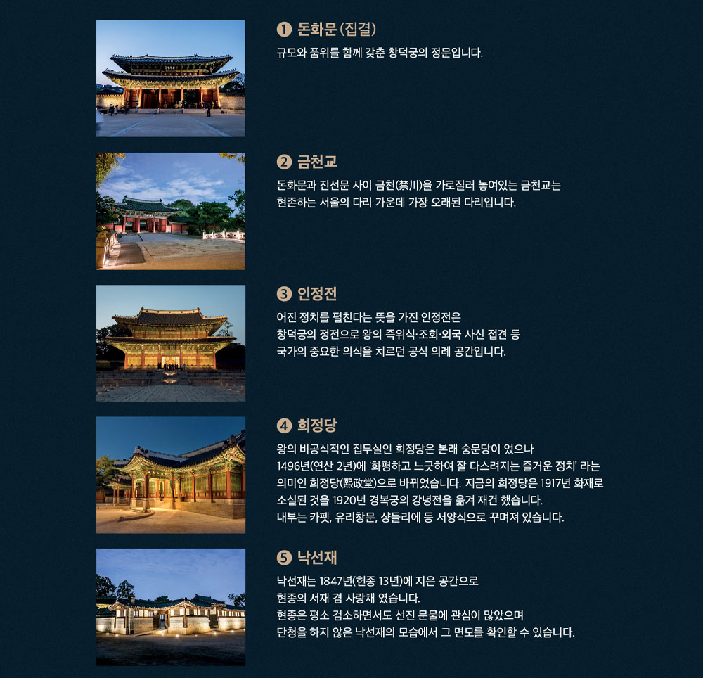 - 주요 코스: 돈화문 - 금천교 - 인정전 - 희정당 - 낙선재 - 상량정 - 부용지·부용정 - 애련지 - 연경당- 후원숲길 - 금호문