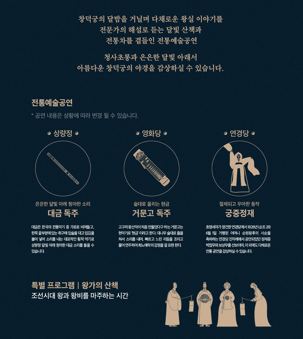 - 특징: 청사초롱을 들고 창덕궁 후원을 거닐며, 전통 공연과 다과 체험을 즐길 수 있습니다.