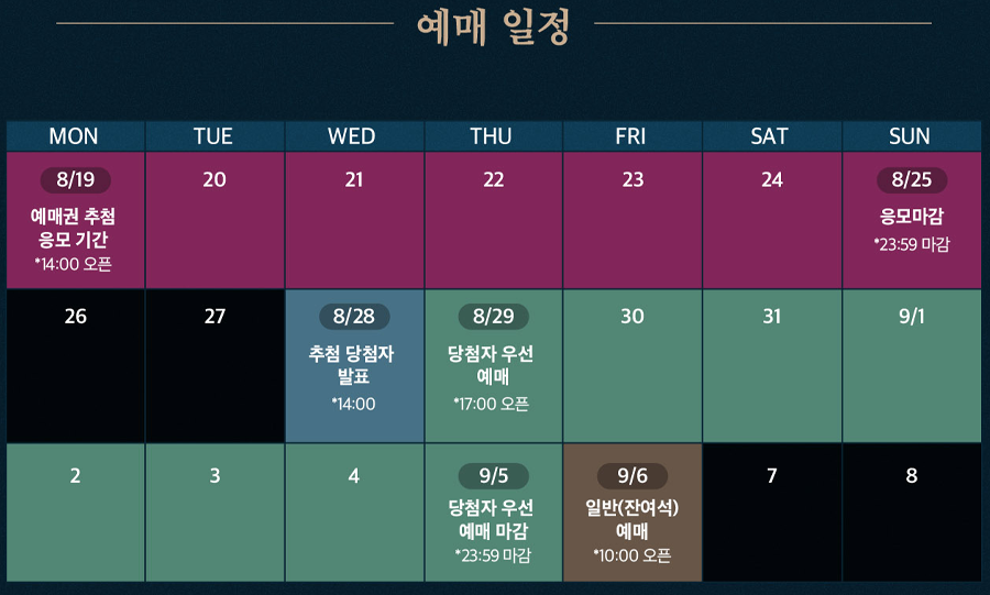 만약, 사전 예약을 놓치셨다면 9월 6일 오전 10시에 일반 예매가 오픈됩니다. 사전예약 잔여석으로 선착순 예매이니 놓치지말고 서두르셔서 예매하시기 바랍니다.