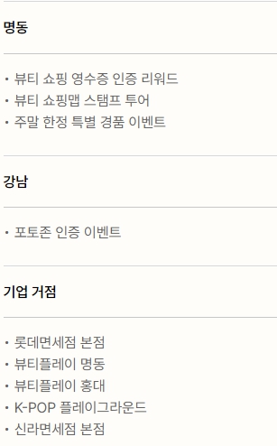 - 경품 제공: 명동에서는 쇼핑 영수증을 제시하면 다양한 경품을 받을 수 있습니다. 예를 들어, 특정 금액 이상을 구매한 고객에게는 뷰티 샘플이나 특별 제작된 기념품이 제공됩니다.