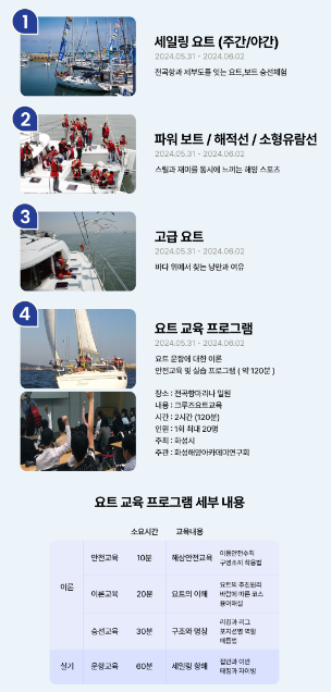 세일링 요트파워보트 체험은 방문객들에게 바다 위를 직접 항해하는 짜릿한 경험을 선사합니다.