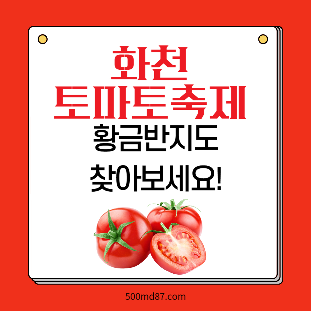 강원특별자치도 화천군에서 매년 개최되는 화천토마토축제가 올해도 어김없이 찾아옵니다. 2024년 8월 1일부터 8월 4일까지 4일간 펼쳐지는 이 축제는 다양한 프로그램과 이벤트로 가득 차 있습니다. 이번 글에서는 화천토마토축제의 주요 프로그램과 즐길 거리 이 외에도 황금반지를 얻을 수 있는 이벤트도 진행하니 자세하게 소개하겠습니다.