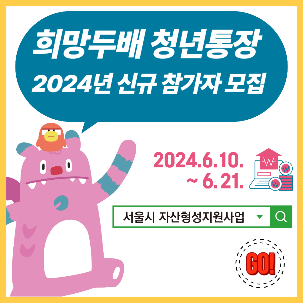 서울시에서는 일하는 청년들이 희망찬 미래를 준비할 수 있도록 자산형성을 지원하는 희망두배 청년통장의 2024년 신규 참여자를 모집합니다.