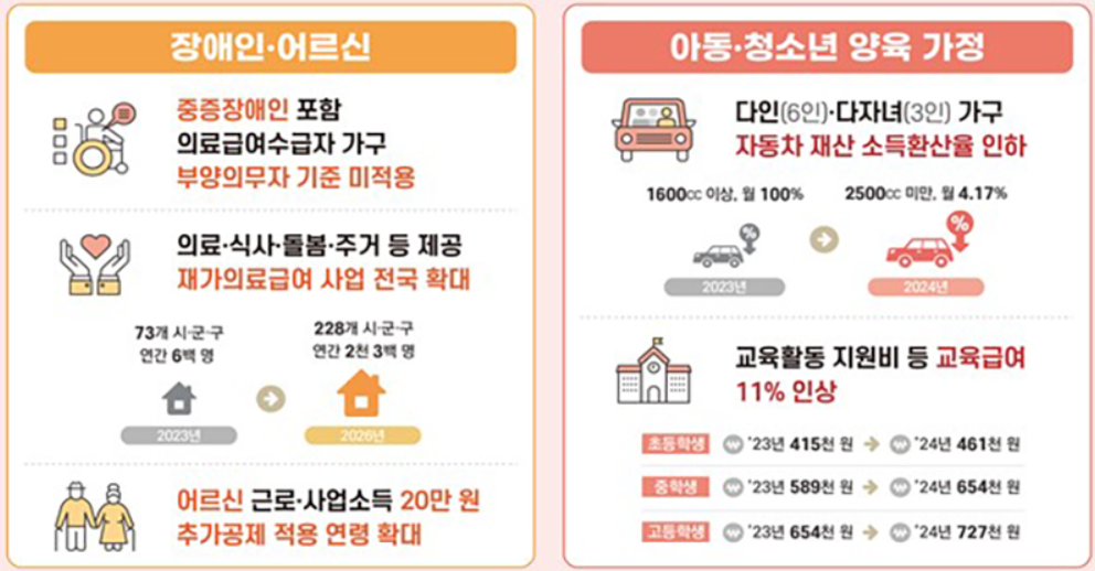 생계급여 선정기준은 기준 중위소득의 30%에서 32%로 높였고, 4인 가구 기준 생계급여 지원 수준을 2023년 기준 월 162만 1000원에서 2024년 기준 월 183만 4000원으로 21만 3000원인 13.16% 인상하였습니다. 근로·사업소득 추가공제 대상 연령 기준을 2023년 기준 24세 이하에서 올해 30세 미만 청년으로 완화하였습니다. 중증장애인이 있는 수급가구는 의료급여 부양의무자 기준을 미적용하고, 2023년 이후 동결된 의료급여 부양의무자 재산기준을 완하해 의료급여 사각지대를 해소하였습니다.