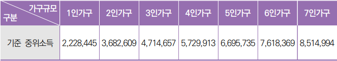 8인 이상 가구는 7인가구 기준 중위소득에서 6인가구 기준 중위소득의 차액을 7인가구 기준 중위소득에 더하여 산정합니다.