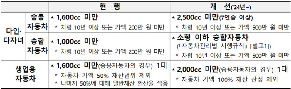 자동차 보유 필요성이 높은 6인 이상 다인·3명 이상 다자녀 수급가구의 승용·승합자동차에 대한 일반 재산 환산율 적용 기준을 완화되었습니다. 생업용 자동차 1대는 재산가액 산정에서 제외하고, 생업용 자동차 중 승용자동차의 기준도 1600cc 미만에서 2000cc 미만으로 완화되었습니다. 2023년도와 마찬가지로 차령은 10년 이상으로 변경이 없지만 차량 가액은 200만 원에서 500만 원 미만으로 변경되었습니다.