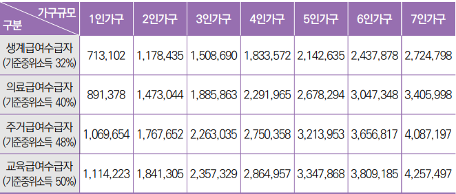 생계급여 수급자 선정기준인 기준 중위소득의 32%는 동시에 생계급여 지급기준에 해당합니다. 8인 이상 가구의 급여별 선정기준 계산 1인 증가시마다 7인가구 기준과 6인가구 기준의 차이를 7인가구 기준에 더하여 산정합니다. 8인가구 생계급여수급자 선정기준은 3,011,718원=2,724,798원(7인 기준)+286,920원(7인 기준-6인 기준)입니다.