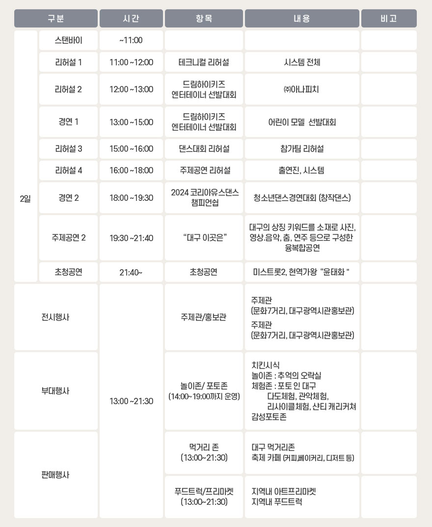 - 주제 공연: "대구를 잇다", "대구 이곳은"