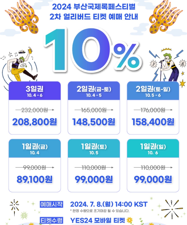 2024 부산국제록페스티벌의 2차 얼리버드 티켓은 7월 8일 오후 2시(KST)부터 YES24 티켓에서 단독으로 판매됩니다. 이번 2차 얼리버드 티켓은 10% 할인된 가격으로 제공되며, 한정 수량으로 판매되어 조기 매진될 가능성이 높습니다.