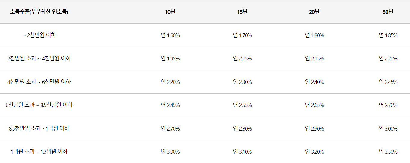- 부부합산 연소득 8.5천만원 초과인 경우는 한국은행 고시 예금은행 주택담보대출 금리와 은행연합회 고시 시중은행의 분할상환방식 주택담보대출 최저금리 중 가장 작은 값을 적용합니다.