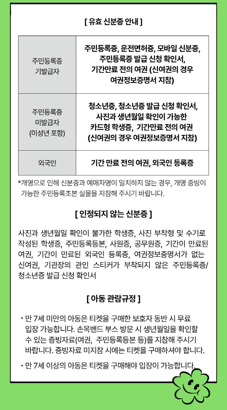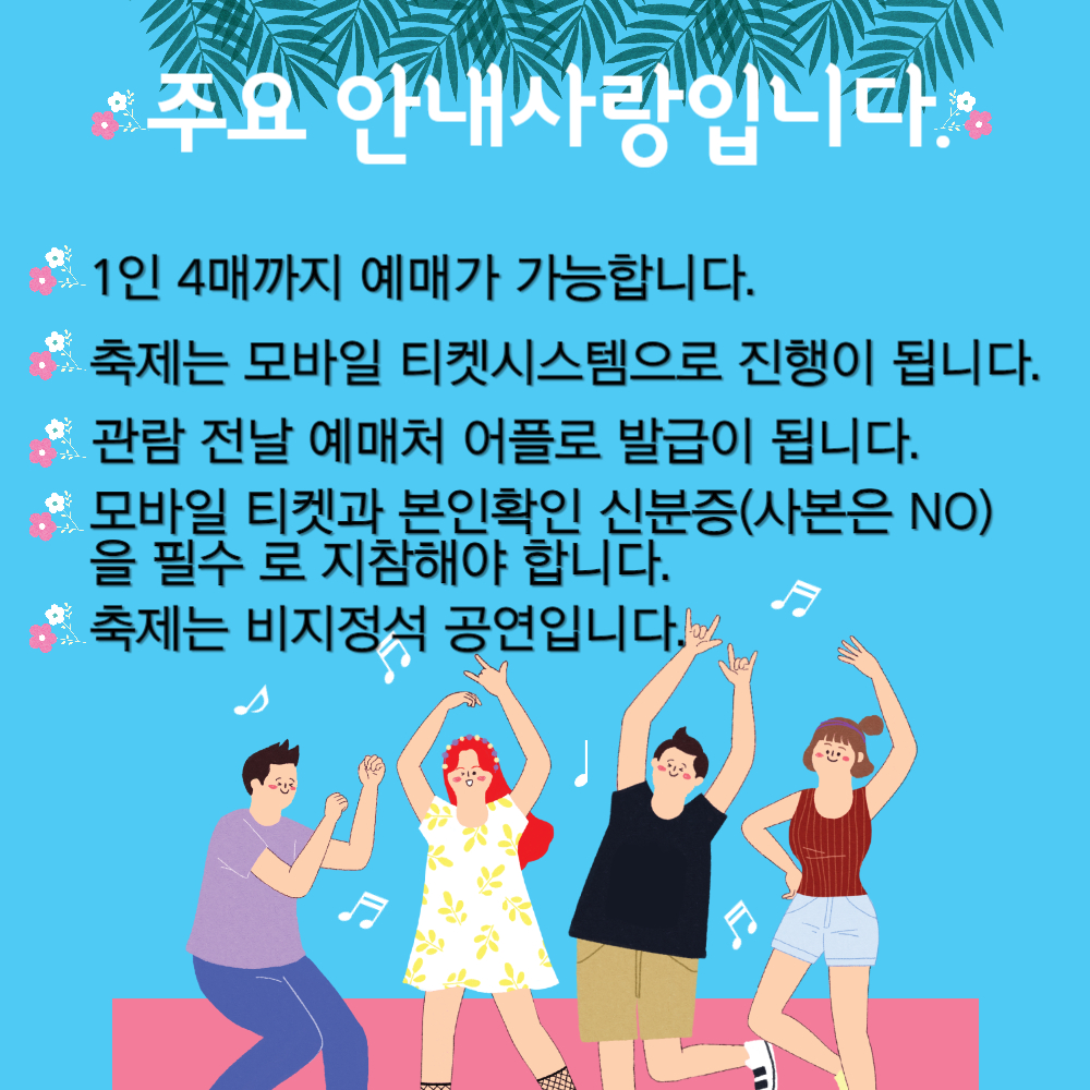 모바일 티켓과 신분증 확인 후 손목밴드를 수령해야 하며, 대리 수령은 불가합니다. 소지품 검사는 입구에서 진행되며, 금지 물품을 폐기해야 합니다. 모든 좌석은 비지정석이며, 피크닉 구역에서만 매트를 사용할 수 있습니다. 축제 기간 동안 공식 사진 및 비디오 촬영이 진행되며, 분실물은 현장 안내 부스를 통해 문의할 수 있습니다. 안전하고 즐거운 축제를 즐기시기 바라겠습니다.